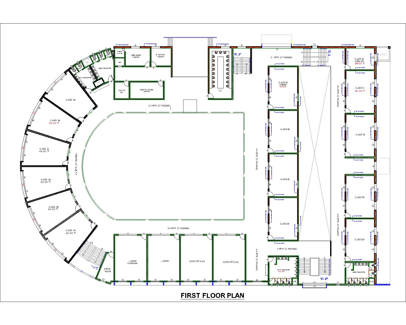 The academic blocks are organized around a central open courtyard, a focal space that allows natural light and ventilation to flow freely while creating a communal hub for assemblies and events. Four distinct zones define the campus: the administrative block to the north, the activity and laboratory block to the south, a senior and pre-primary zone to the east with a staggered pre-primary structure for visual connectivity, and the circular classroom block to the west. The circular plan of these senior and junior classrooms breaks away from conventional boxy layouts, improving sightlines and enhancing teacher–student interaction.