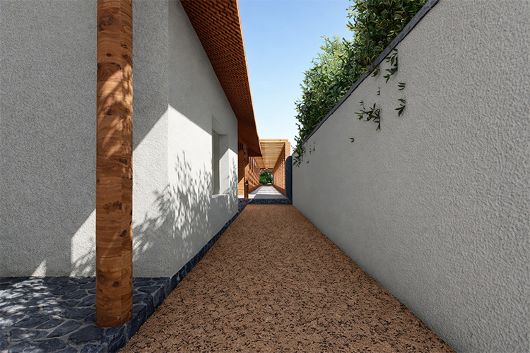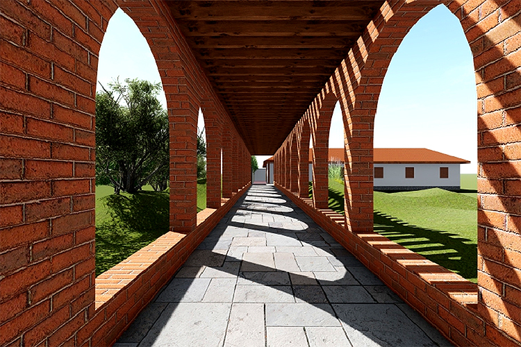 These blocks are connected by a striking brick colonnade, articulated through a rhythmic series of arches and a pergola above, creating dramatic patterns of light and shadow.