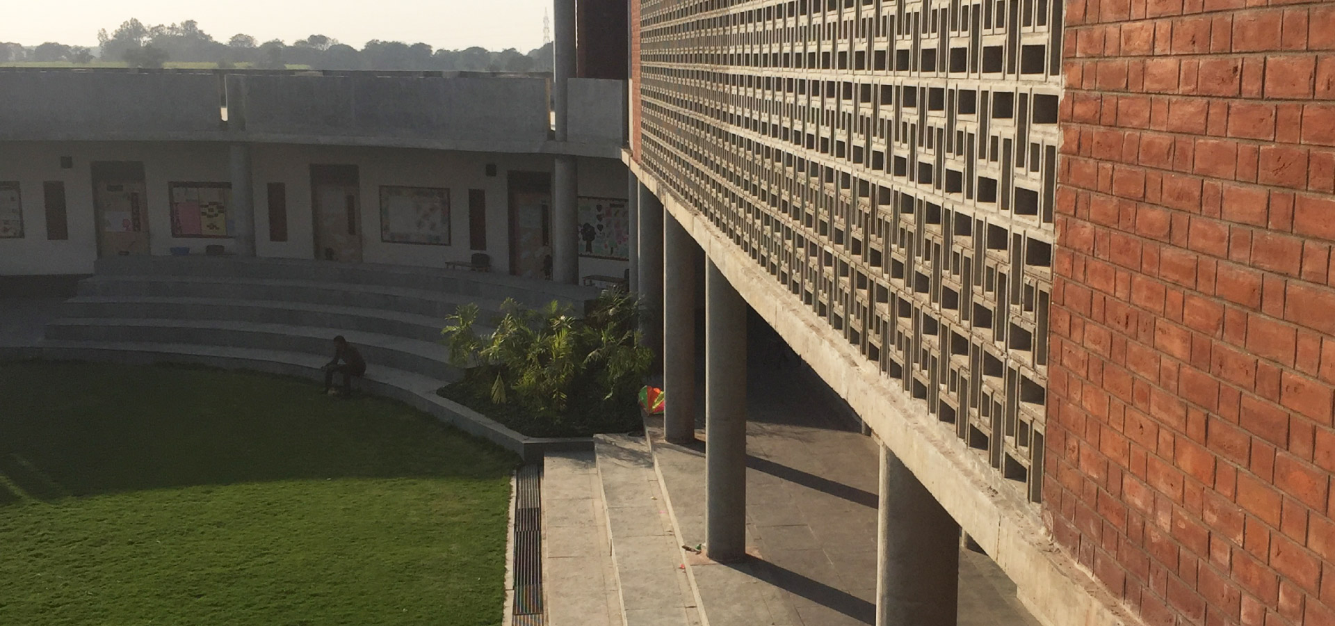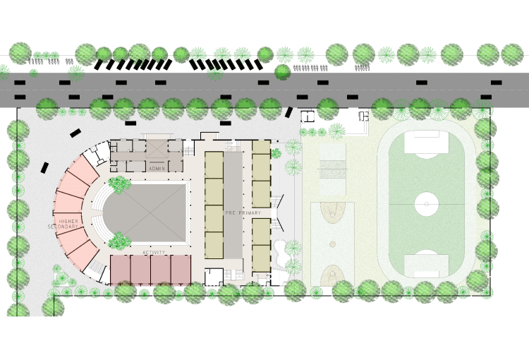 The main building has been divided into 4 parts each serving its own function. The block on the North direction is the administrative block. Opposite to it in the South direction is the activity block which consist of labs and activity center,Connecting the senior and junior school block. On the east side are the senior and pre- primary having two blocks the pre- primary being the staggered building. Lastly, on the west side are the classrooms which are circular in shape are utilized by seniors and juniors for seminars. The center of the building has a courtyard which connects all the blocks and could be utilized for various functions and gathering and a sense of central open space allowing natural light and wind flow. Thoughtful designed and constructed classrooms on the West are circular in shape breaking the standard concept of boxy classrooms, where visual connection to the teacher and the board becomes clearer for students. This design occupies less space and makes it more functional.